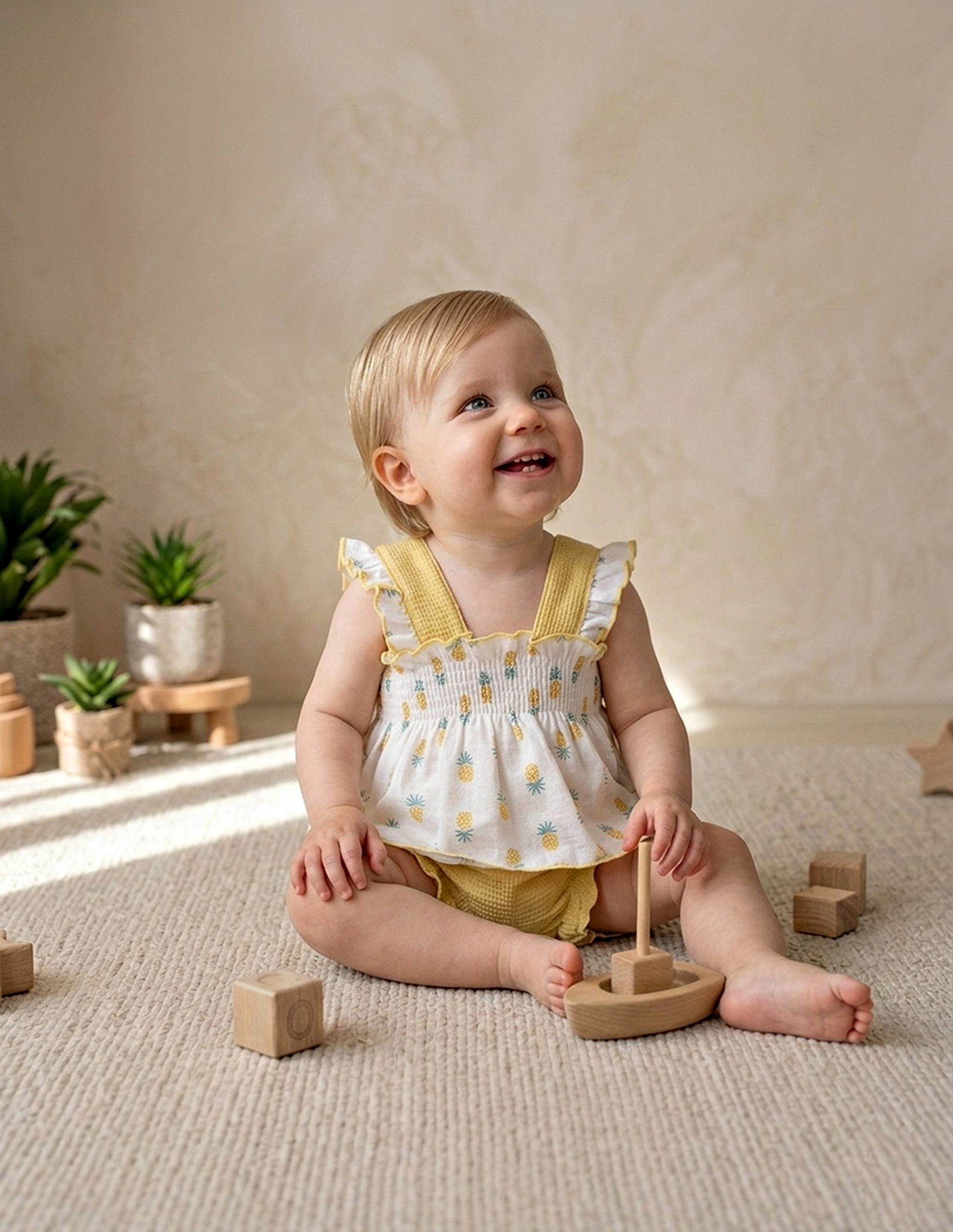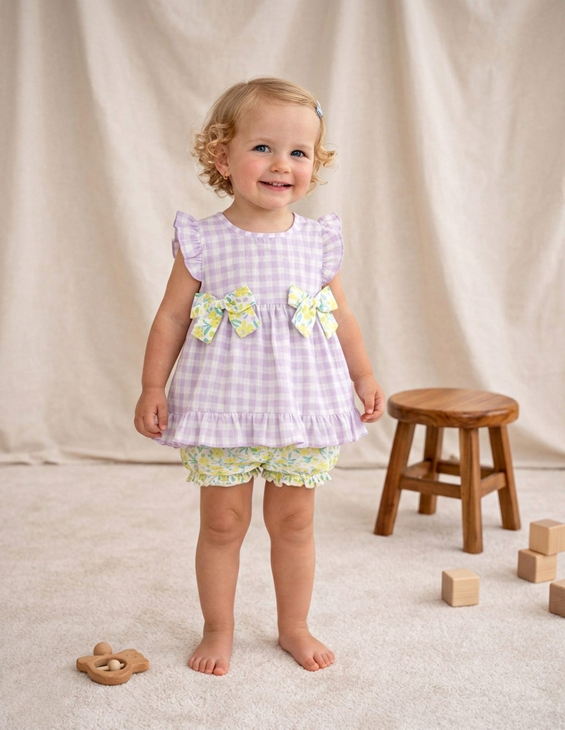 Descubre una colección diseñada para celebrar la alegría de la infancia. Desde la frescura de nuestros conjuntos de algodón en amarillos vibrantes, hasta el encanto de los clásicos cuadros vichy y los tejidos de punto calado en tonos rosas y azul cielo.